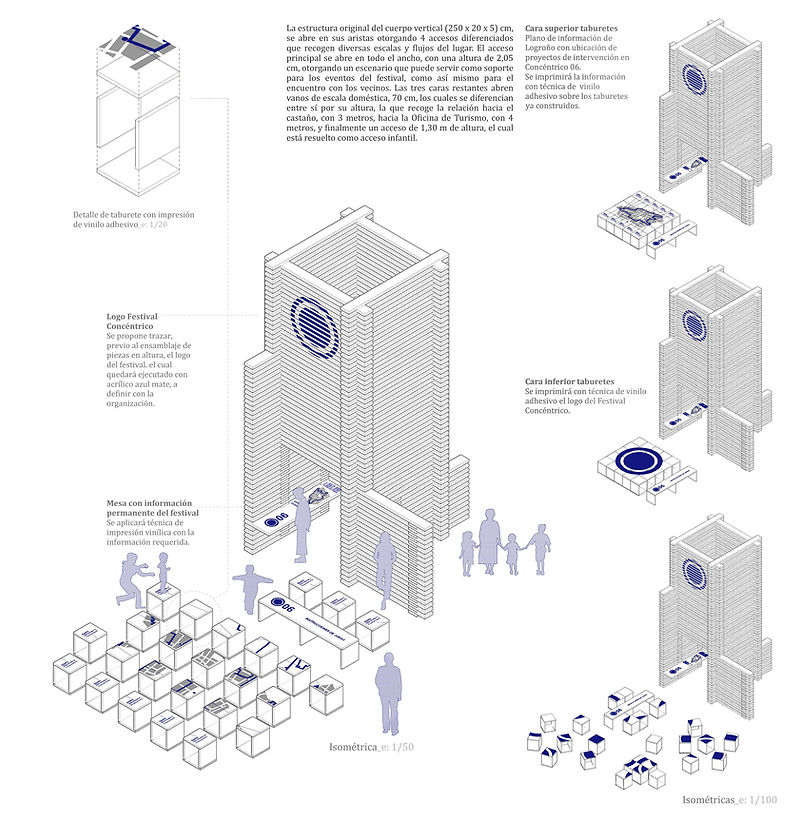 Su basamento se abre para hacer desaparecer las aristas de la pila vertical, estableciendo de esta manera diversos accesos, los cuales recogen las distintas escalas de relación con el lugar y sus flujos de circulación. Esta dinámica a ras de suelo, se termina de estructurar con una pieza horizontal que intenta abrir un escenario urbano lúdico a través del “juego”. Para ello se plantea un gran puzle de taburetes, que son a su vez mobiliario urbano para la celebración del festival, y un gran tablero de información que se transformará a partir de la propia interacción de las personas.